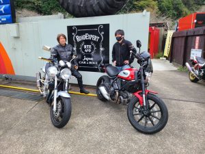 本日は、当店ご購入、メンテご利用のMさま(左)YAMAHA XJR1300、レンタルご利用のKさま(右)DUCATI Scrambler800 ICON